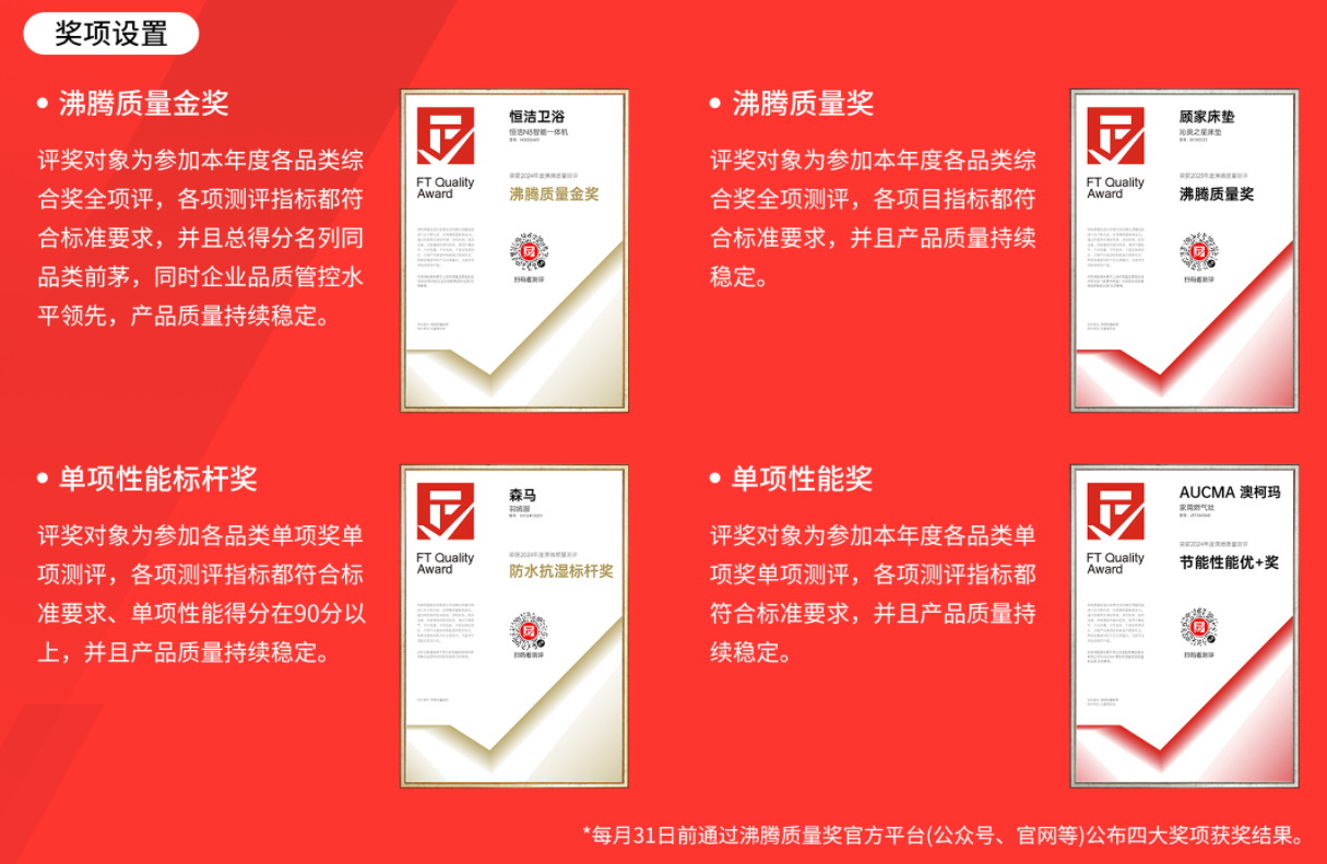 沸騰質量獎獎項設置有綜合獎與單項獎,其中,綜合獎設有代表該品類當前品質風向標的最高獎——“沸騰質量金獎”,以及代表好品質的“沸騰質量獎”;單項獎設有“單項性能標桿獎”、“單項性能獎”。